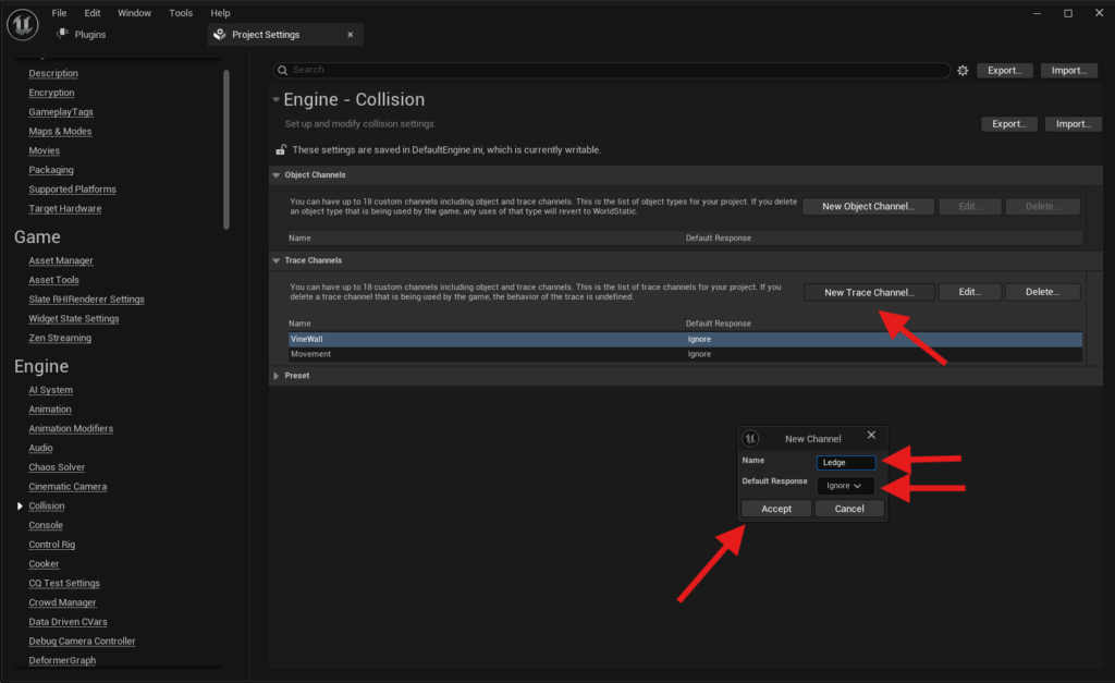 Under Project Settings > Engine > Collision, create these Trace Channels: