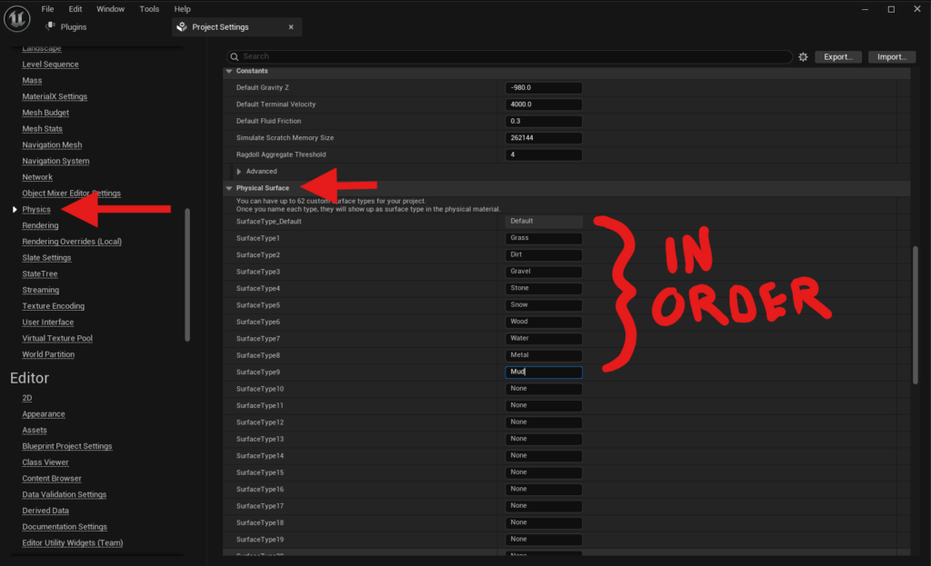 Under Project Settings > Engine > Physics, create these Physical Surfaces in this exact order: