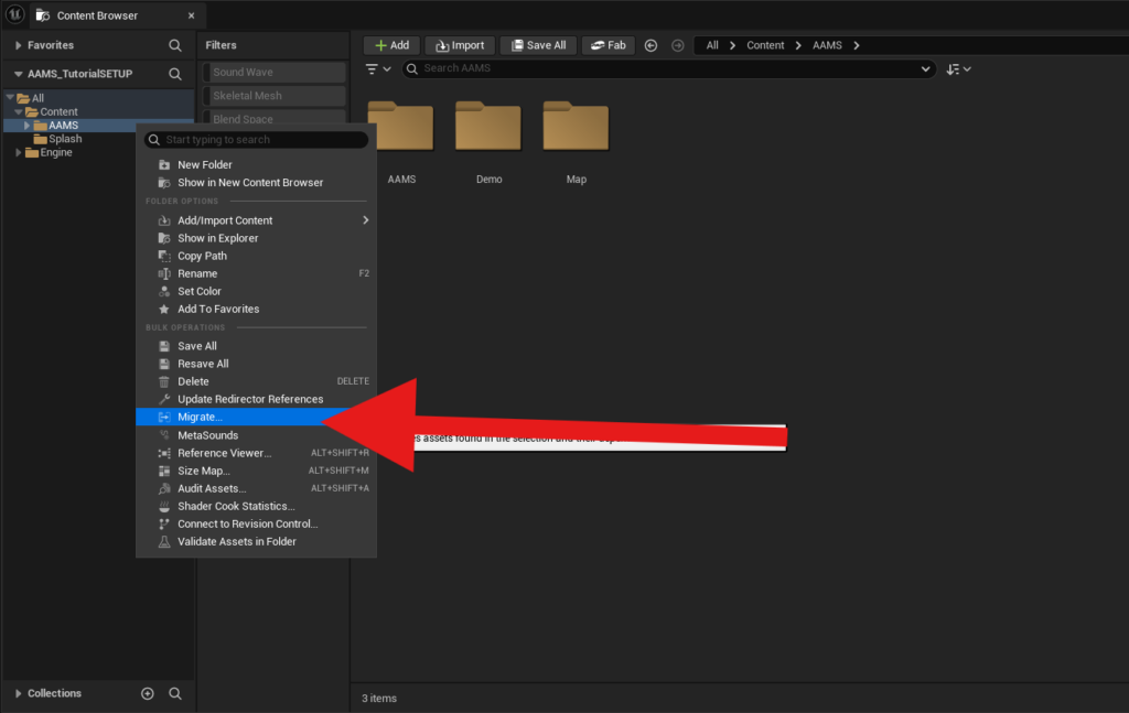 Open the AAMS project you created. In the Content Browser, right-click the AAMS folder and select Migrate from the popup menu.