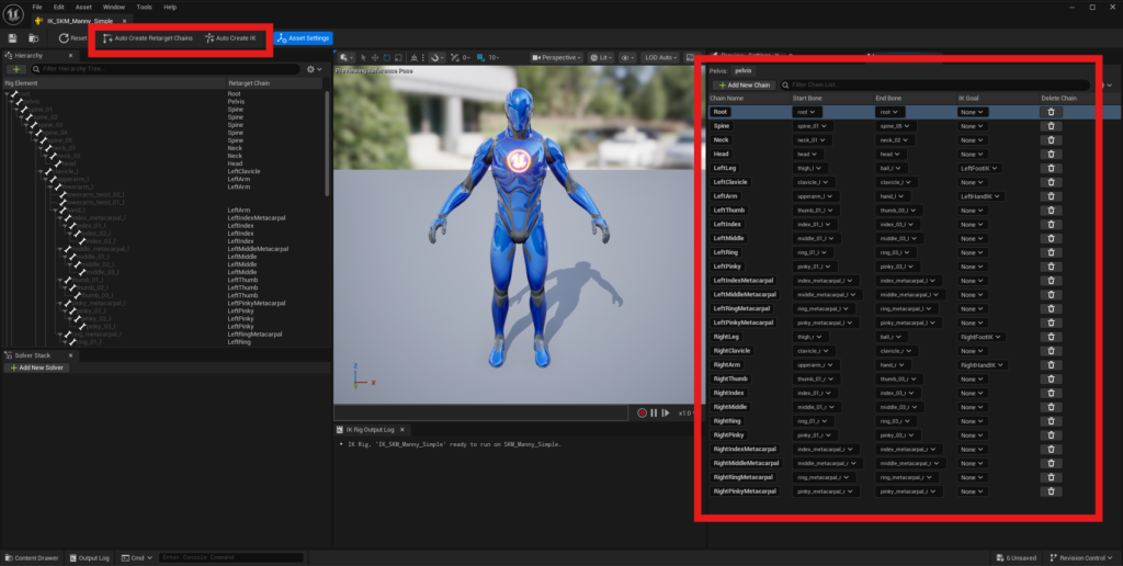 For most skeletons, you can click Auto Create Retarget Chains at the top of the editor, which will automatically generate the chains for you. Then click Auto Create IK next to it.