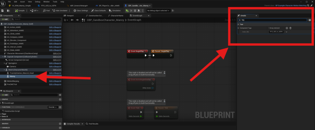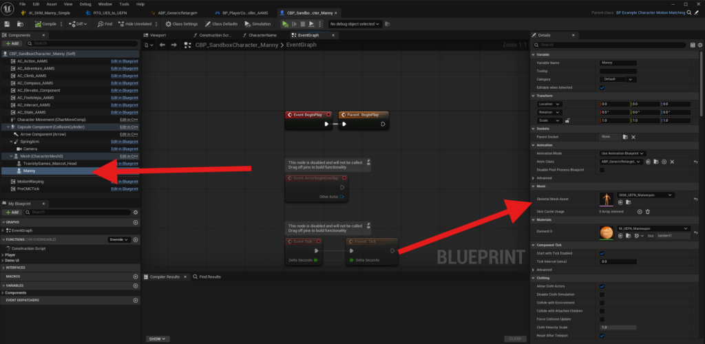 Inside the Blueprint, select the Manny mesh and change it to your character’s Skeletal Mesh.