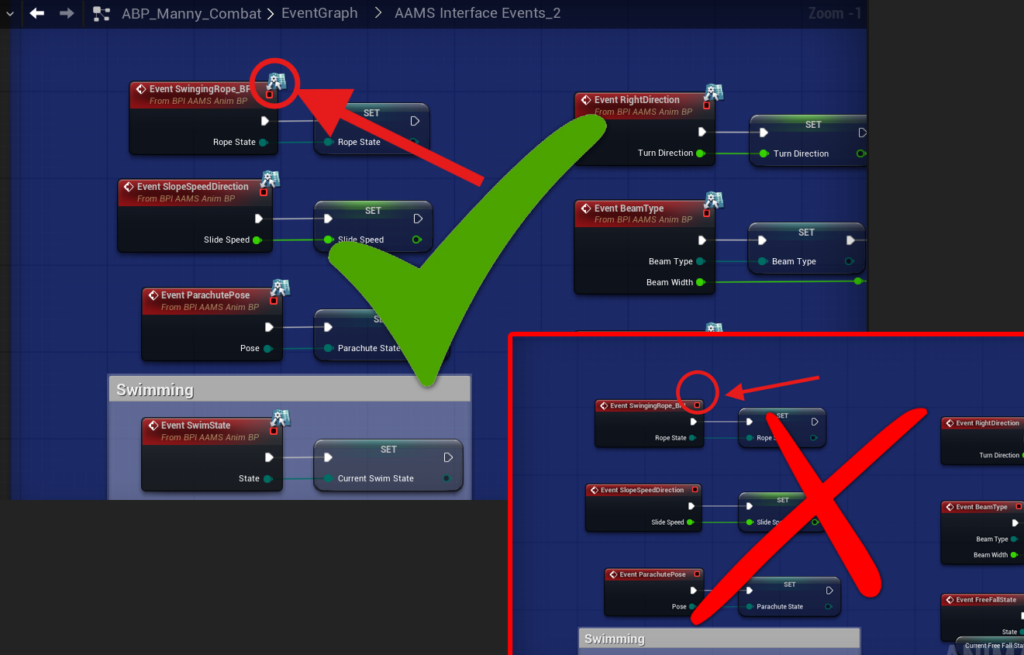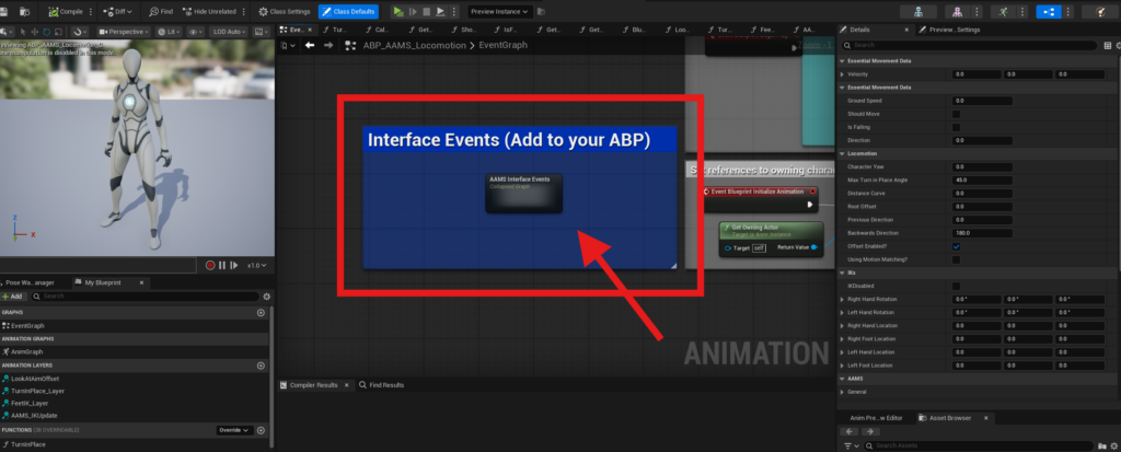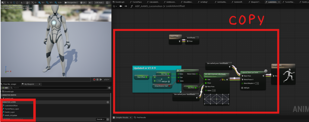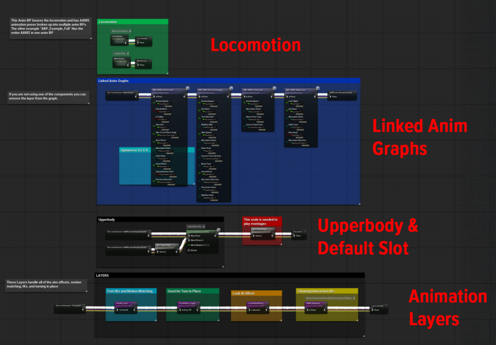 To add them, drag them from the My Blueprint panel into your Anim Graph and connect them, or copy them from the AAMS ABP and paste them into your own graph.