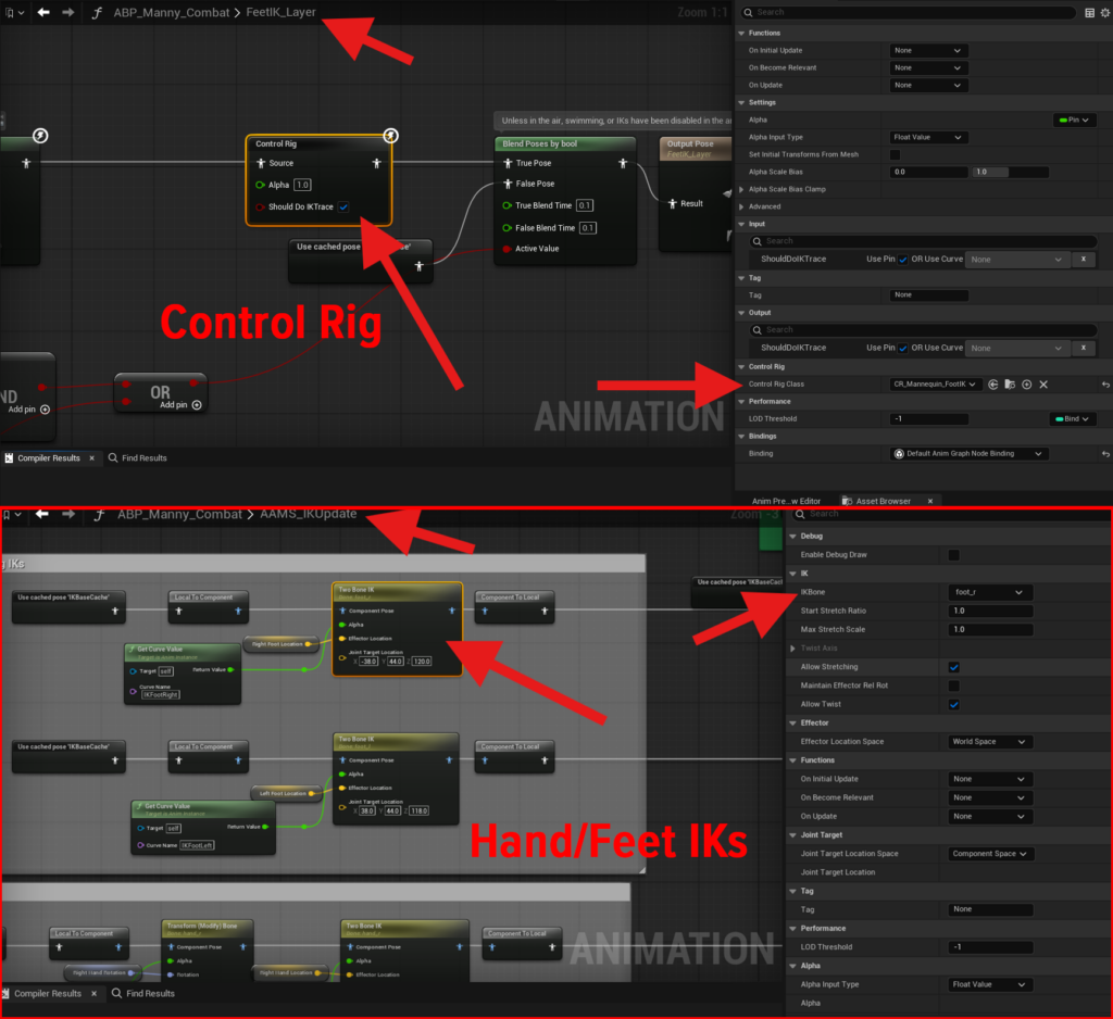 These should be the last nodes before the Output Pose, because they handle final adjustments such as placing the feet on the ground or aligning the hands to ledges. You do not want later animation nodes changing those final results.