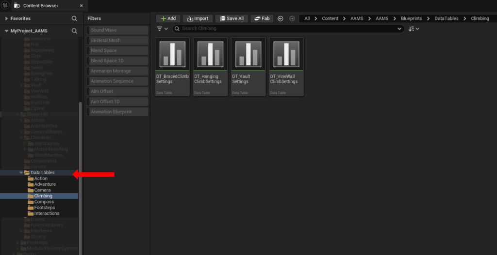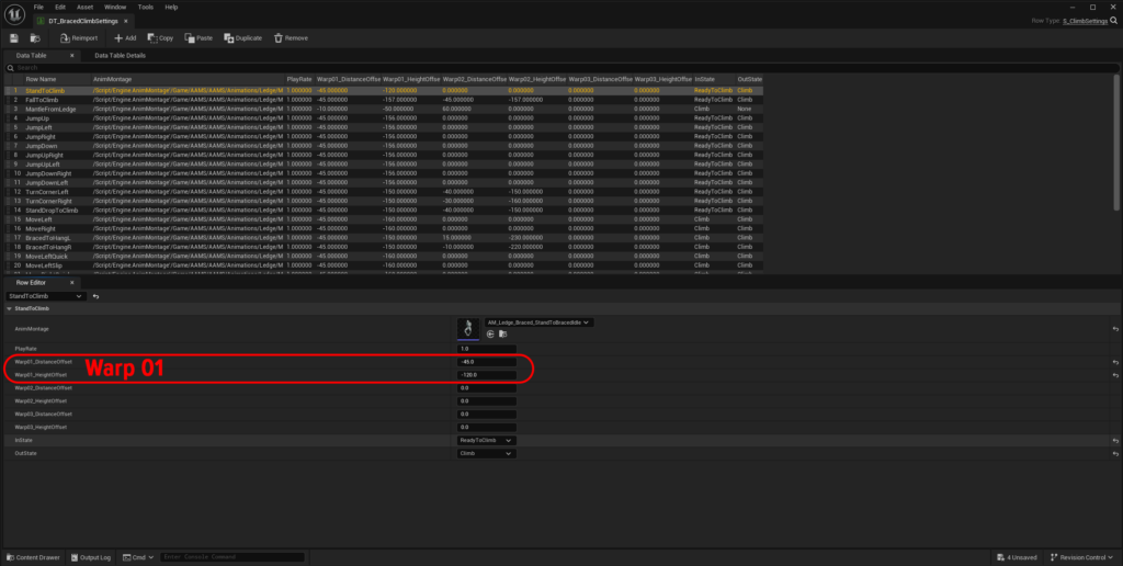 Most of the animation-related Data Tables in the DataTables folder include settings that control how the character lines up during movement mechanics. These tables often contain offset values that adjust the character’s location at specific points in the animation. If your character is smaller or larger than the AAMS example character, these values will often need to be adjusted.